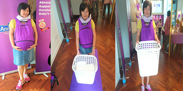 | 模拟怀孕后期需扛起一蓝衣服。正确的方法是,右脚跪地,左脚撑着肚子。在用力拿起! |